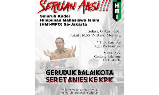 Jakarta, suarahimpunan.com – Teka-teki terkait dengan pamflet aksi unjuk rasa dengan tajuk ‘Geruduk Balaikota, Seret Anies ke KPK’ akhirnya terpecahkan. Aksi yang mengatasnamakan HMI MPO se-Jakarta itu diinisiasi oleh HMI MPO Cabang Jakarta dan Cabang Jaksel.